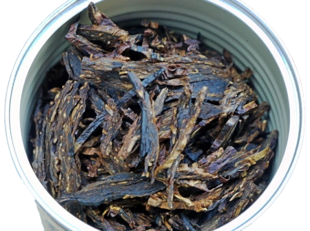 La boîte de 225g que je viens d'ouvrir, date de 2004. Je suis curieux de savoir comment les herbes ont évolué sous l'influence de ces onze ans d'encavement. Le tabac n'est pas en contact avec les parois de la boîte puisqu'il se trouve dans un sac en plastique. Vu que le métal n'est pas recouvert d'une couche antirouille, c'est une bonne pratique. D'un autre côté, le plastique aide à conserver l'humidité, ce qui n'est pas exactement un avantage dans le cas des mélanges de Smokers' Haven. Ce sont en effet des tabacs systématiquement trop humides et même après onze ans mon Exotique a besoin de sécher un peu avant d'être bourré.