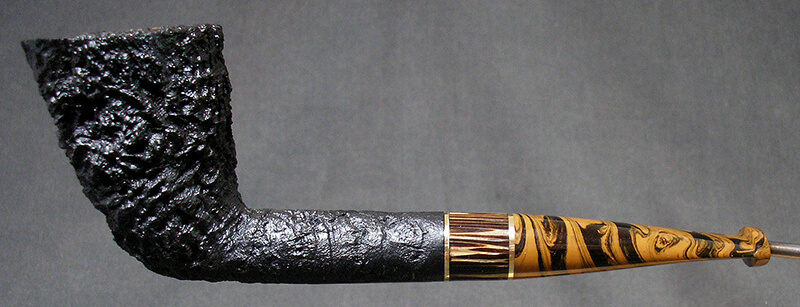Voici quelques années, l’artisan belge avait présenté une pipe qu’il avait baptisée canadian with an edge. Un jeu de mots. D’une part, la tige de la canadienne n’était pas classiquement ovale, mais étalait de chaque côté une arête. An edge. D’autre part, le foyer pouvait en choquer plus d’un, vu que sa surface bien flammée et parfaitement lisse semblait complètement gâtée par un gigantesque défaut, en réalité un rusticage imitant la croute de plateau. Or, en anglais, l’expression with an edge signifie quelque chose du genre avec quelque chose de non conventionnel, de bizarre, d’imparfait, voire de provocateur.