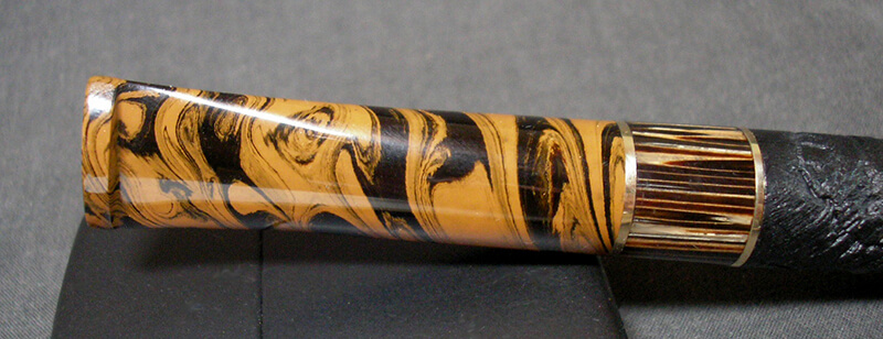 Je vous épargne les détails, mais j’ai fini par casser le bec de ma dublin. Horreur ! Je contacte Trever qui m’explique ce qui a dû se passer et qui me propose de me remplacer le tuyau en employant un matériau qui me conviendra mieux. C’est un peu la douche froide parce que justement j’adorais l’apparence du tuyau d’origine. Trever me console en me garantissant qu’il va chercher des barres d’ébonite qui s’harmonisent avec le zebrano. Le lendemain, il m’envoie une série de photos pour faire un choix. Nous sommes d’accord : le matériau qui convient le mieux, c’est une barre d’ébonite marbrée datant des années 30 et destinée à la fabrication de porte-plume.
