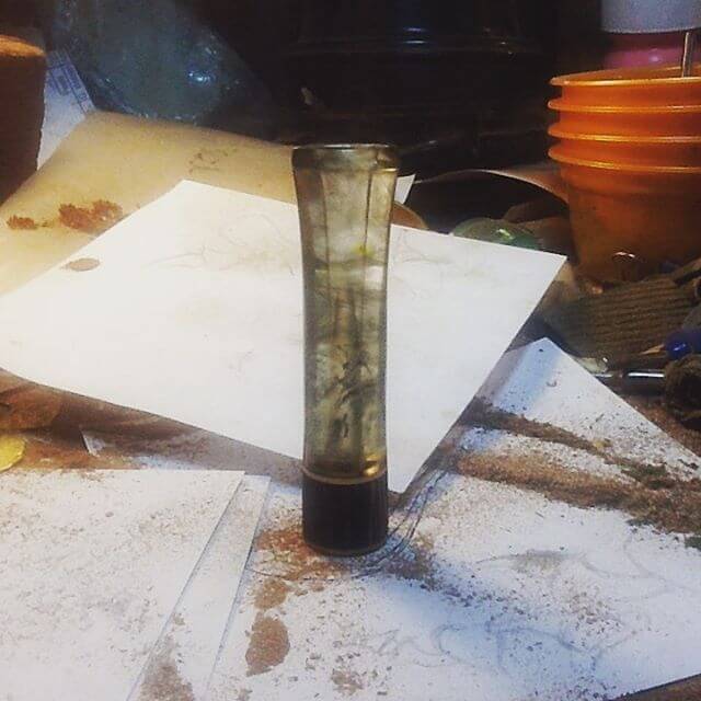 Ma précipitation va s’avérer une erreur. Normalement Trever aurait présenté sa pipe en long et en large sur son site de vente. Parfois ces descriptifs détaillés contiennent des mises en garde du genre attention tige fragile ou déconseillé aux clenchers. Or, cette fois-ci la pipe est déjà vendue avant que Trever n’ait pu rédiger son texte. Plus tard, trop tard pour moi, il me dira que chaque fois qu’il propose à la vente une pipe montée de pareil tuyau, il stipule clairement que cette résine qu’il fabrique lui-même est plus fragile que l’ébonite ou l’acrylique.
