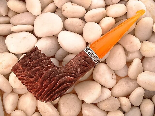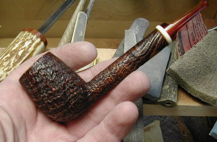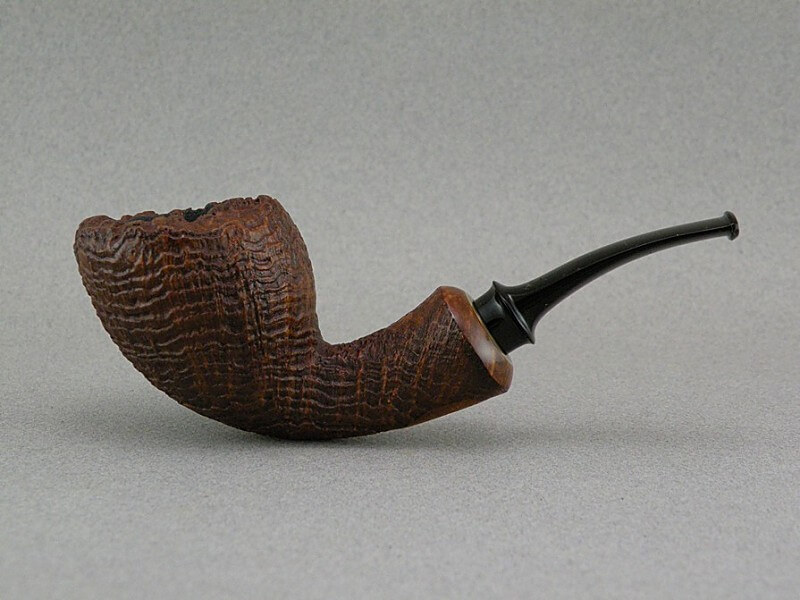 Ceci dit, il y a de l’espoir : récemment Dunhill a réintroduit la finition County sur le marché. On verra. Et puis parmi les pipiers qui se sont fait une réputation au cours de la dernière décennie, il y en a plusieurs comme Cornelius Mänz, Trever Talbert ou Victor Yashtylov qui, de temps à autre, finissent des sablées en brun. Pareil en Italie : une des plus belles sablées brunes qu’il m’ait été donné d’admirer, c’était une Rinaldo et cette année j’ai pu acquérir une Moretti sablée avec une teinture tête-de-nègre du plus bel effet. Quant à la France, récemment David Enrique a introduit à ma demande une finition baptisée Havane dont la couleur chaude me fait fondre. Il est donc bel et bien possible de dégoter de belles brunettes, mais elles restent tout de même très minoritaires. C’est d’autant plus surprenant que Jim Cooke, le roi incontesté du sablage qui sert de phare à tout sableur ambitieux, présente régulièrement des sablées brunes rien moins qu’époustouflantes.