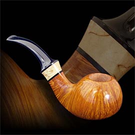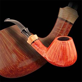 Il ne faudrait pas en conclure que toute pipe faite à la main par un artisan soit automatiquement une high grade. Il convient d’ajouter le deuxième critère qui est celui du perfectionnisme. Ca commence avec le choix des matières premières : de la bruyère triée sur le volet par un des coupeurs les plus prestigieux comme Mimmo de Romeo Briar, des tubes d’ébonite ou de cumberland importés d’Allemagne, des matériaux de décoration nobles. Et puis, il y a l’outillage. Pour preuve le blog de Trever Talbert dans lequel il nous raconte par exemple ses soucis pour trouver le compresseur parfait pour sa cabine de sablage. D’ailleurs le typique pipier haut de gamme fabrique lui-même une partie de ses outils de travail. Ca continue au moment de la conception de la pipe. Et là il y a deux approches diamétralement opposées qui toutefois ont le même objectif : créer une pièce unique où forme et flamme constituent une réelle harmonie. La première école se laisse guider par le grain et cherche à découvrir au cours du façonnage de la bruyère la pipe qui se cache dans le plateau. C’est au pipier de délivrer ce que Mère Nature enfante après une gestation de plusieurs décennies. L’autre école cherche à dompter la nature et à lui imposer sa volonté. Typiquement, ces pipiers-là imaginent des modèles, ébauchent des croquis, font des plans techniques et ensuite fouillent leur stock de bruyère à la recherche du plateau parfaitement adapté à leur projet. Au moment de l’exécution technique, du perçage, du tournage du tuyau, du modelage de la lentille, du montage, du polissage, de la finition, les deux écoles se rejoignent : pendant de longues heures tous ces artisans travaillent dans l’esprit de ces moines médiévaux peignant avec un rare sens du détail des miniatures. Dans cette quête de la pipe parfaite, un artisan peut passer une demi-journée à poncer la surface de la bruyère avec des papiers de verre de plus en plus fins. Un pipier m’a raconté comment il a travaillé pendant six heures pour modeler un tuyau et sa lentille et pour l’adapter parfaitement à la tige. Bref, sans cet esprit obsessionnellement perfectionniste, pas de vraie high grade.