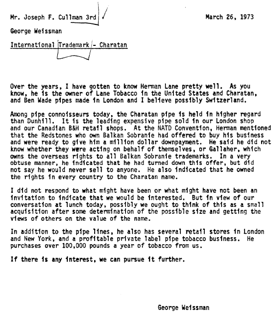 Cette période assez chaotique qui a mené au rachat de Lane Ltd. par Dunhill, dans le milieu de l’année 1976 est assez bien documentée. A titre de curiosité, j’ajoute ci-dessous une lettre du 26 mars 1973 de laquelle ressort assez bien la situation de CHARATAN.