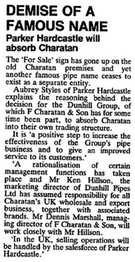 Je vais tout de suite faire état d’un extrait d’un journal spécialisé de 1982 dans lequel il est fait mention de la décision de Dunhill de déplacer la production des Charatan chez Parker – Hardcastle. Inutile de répéter que cet événement a été de première importance pour la marque Charatan (je dirai un des événements les plus importants). Il n’y avait donc pour moi pas d’autre choix que de diviser la "période Dunhill" en deux. Toute autre approche ne peut se prétendre exhaustive.