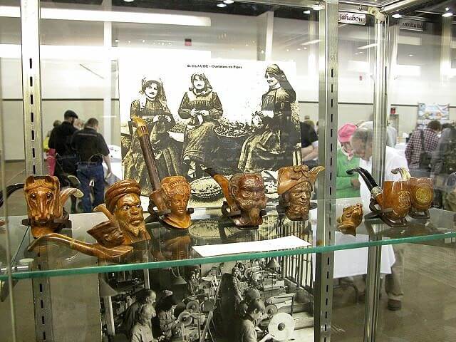 À l'entrée du hall d'exposition, les visiteurs pouvaient admirer des vitrines de collection, mais tout particulièrement, une partie de la collection du musée de la pipe de Saint Claude, des tabatières et des pipes anciennes. J'avoue que, après les années de méfiance sanclaudienne que j'avais connue au sujet de cette manifestation, j'étais particulièrement heureux des efforts faits cette année pour montrer que cette ville jurassienne existe toujours. C'est Jacky qui les avaient organisées, et cela lui valut de recevoir le diplôme Directors Award pour cette action en faveur de l'éducation.