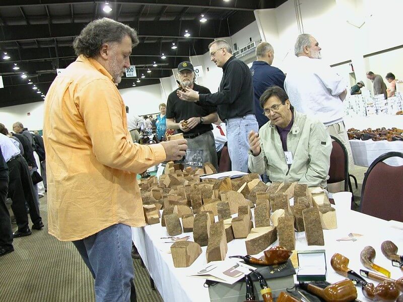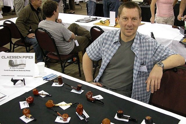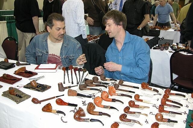 Dans le grand hall d'exposition, 280 tables étaient réservées. Mais, j'ai vite remarqué que contrairement à 2003, une quinzaine de tables n'étaient pas occupées, dont l'une d'entre elles, prévue pour Trever Talbert, et elles le sont restées. Après 7 ans d'absence, j'étais peut-être plus sensible que d'autres aux différences entre les versions 2003 et 2010, mais il est clair que le nombre de participants était bien inférieur. Mon estimation de 2003 était de 3 000 environ. Cette année, je dirai 1 200 à 1 500. Par ailleurs, un rapide tour dans les allées m'a donné l'impression d'une absence de découvertes et de nouveautés. Mais, les plus belles pipes avaient peut-être déjà été vendues dans les chambres, dans les jours précédents, et puis, avec le temps et avec tout ce que nous montre Guillaume chaque jour, je m'étonne peut-être moins facilement.