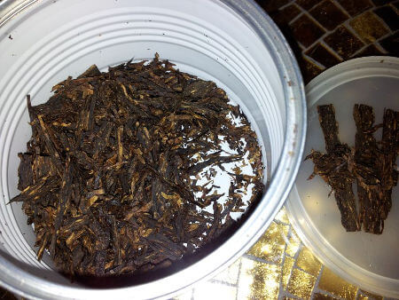 Acidité volatile et vinaigre balsamique, ketchup et cube bouillon, bref du McClelland archétypique. Par contre, niveau coupe, c’est la surprise totale. Quand je lis sur une boîte de tabac qu’il s’agit d’un shag cut, je m’attends à des brins en coupe tellement fine qu’ils rappellent le tabac à rouler. Or, me voilà en train d’oeiller des tranches de cake qui se décomposent au toucher pour former un genre de broken flakes. Ah bon. Ces tranches qui se défont, sont plus fines que des flakes, ce qui permet de les plier et de les bourrer telles quelles. Il va de soi qu’on peut également les effriter sans problèmes.