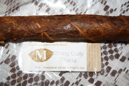 Le tabac phare de la maison est sans conteste le Strang-Curly qui est proposé en deux versions : ungeschnitten et geschnitten. Ce dernier se présente sous forme de curlies à l’instar du Three Nuns ou des divers roll cakes de chez Mac Baren. Moi, j’ai opté pour la version non coupée, ce dont je suis ravi à la vue du rouleau tout droit de 25cm avec un diamètre de 2,5cm qui m’est livré. Que c’est beau ! L’extérieur est composé de deux feuilles de tabac entières, l’une nettement plus foncée que l’autre. A l’intérieur on découvre un centre presque noir entouré de brun et de fauve. Au toucher, le cylindre est souple, huileux et frais. L’odeur qu’il dégage est discret et pure nature : ça sent le tabac.