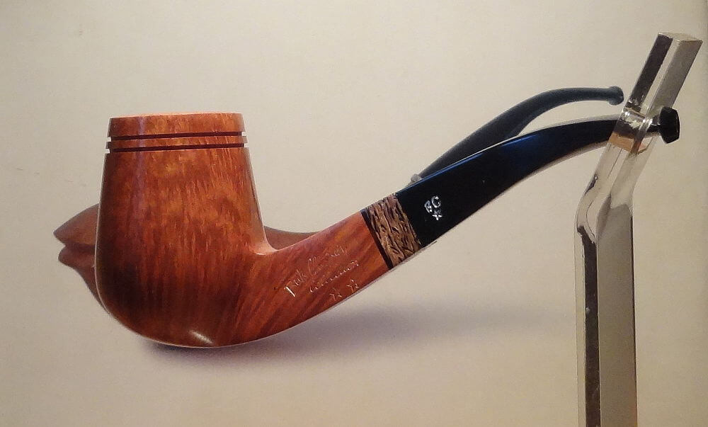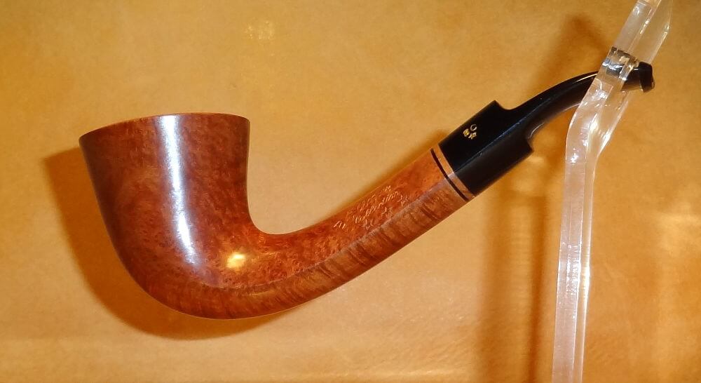 Ca fait maintenant une quinzaine d’années que d’une façon que certains qualifieront d’obsessive, j’explore l’univers en perpétuelle expansion des artisans-pipiers. N’empêche que je n’ai jamais oublié mes débuts et qu’il m’arrive d’être pris d’accès de nostalgie. Dans ces instants, il me vient des envies de sanclaudiennes anciennes, ce qui fait que j’ai fini par acquérir des G.V.G. datant du début du 20ième siècle, une Genod col de cygne d’un âge respectable, une superbe dublin/zulu marquée Au Caïd au grain splendide, sortant d’un stock poussiéreux ou un vieux coffret de présentation contenant trois Chacom Grand Cru vierges (testchacomgrandcru.htm). En outre, l’ami Morel m’a gracieusement offert quelques pipes qu’il a montées à partir de têtes vieilles d’un siècle et une glorieuse et énorme courbe en finition naturelle et montée d’un phénoménal tuyau en corne qui ferait pâlir plus d’une Dunhill LC. Cette XXL anonyme qui sort des brumes de l’histoire dans un état absolument impeccable, nous l’avons baptisée La Vénérable.