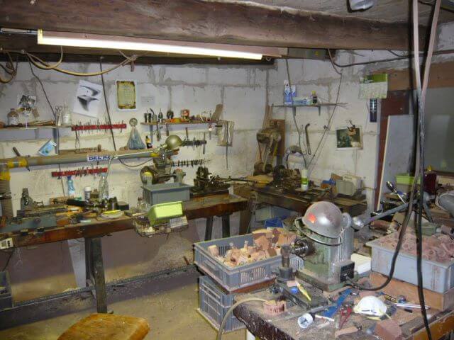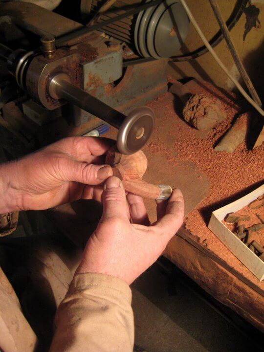 Il est donc grand temps de faire enfin justice à ce pipier qui a bientôt 40 ans de métier et qui depuis des décennies combine son travail d’artisan indépendant avec une carrière au service de Chapuis-Comoy (Chacom). Ce qui est sûr, c’est que le bougre ne laisse pas indifférent. A en croire ceux qui m’avaient fait son portrait, il serait misanthrope et solitaire, mythomane et mégalomane à la fois (tout un programme !), il aurait un caractère de chien. Bref, un sacré personnage. Depuis que j’ai fait sa connaissance, j’ai constaté en effet que c’est une personnalité haute en couleurs et je peux m’imaginer qu’il ne doit pas être facile à vivre tous les jours. Mais ce qui m’a d’emblée frappé, c’est son humour grincheux et caustique. Et puis son manque total d’indulgence envers la connerie. Et son allergie à la suffisance des minus et aux réputations usurpées, notamment de ceux qui aiment bien se faire applaudir pour leurs pipes soi-disant faites main, alors qu’en réalité leur travail se borne au montage d’un tuyau préfabriqué sur une tête achetée. Bref, il a tout pour me plaire, d’autant plus qu’il s’avère une encyclopédie ambulante de tout ce qui touche de près ou de loin à la pipe sanclaudienne. Et puis, ce supposé ermite partage avec moi l’amour de la bonne chère, des vins et des single malts.