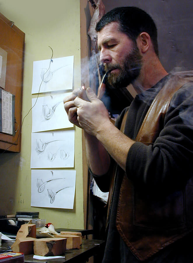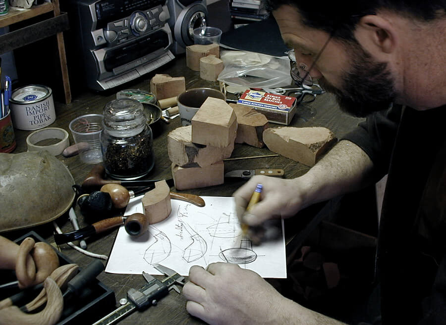 - Mon processus diffère de celui de la plupart des pipiers. Je commence toujours par dessiner. Traditionnellement, les formes sont dictées par les fibres et la texture du bois. Tout mon travail consiste à harmoniser au mieux la forme que j'ai en tête avec la bruyère dont je dispose. C'est difficile, parce que chaque morceau a sa propre personnalité. C'est pourquoi je dessine d'abord, choisis le bois, et redessine encore après, en fonction des exigences dictées par la bruyère. Il s'agit d'un dialogue entre le bois et la forme que j'ai imaginée. L'inspiration est un processus complexe. Une forme en génère une autre. J'aime travailler sur des thèmes de départ, de bons exemples dans mon cas seraient la botanique, ou l'Art Déco, etc. ... Pendant que je travaille, je continue à dessiner, et quand j'ai fini un ensemble de pipes, je sais déjà ce que je vais faire après. Exécuter un groupe de pipe peut me prendre de quelques jours à plusieurs semaines. D'habitude, je travaille par série de cinq ou six pipes de la même famille. J'aime prendre plusieurs pauses pendant que je travaille sur la bruyère, laisser reposer, cela peut m'amener à d'autres choses en cours de route. Ca peut sembler un peu métaphysique, mais cette façon de faire est importante pour moi.