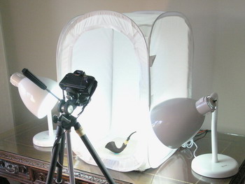 La diffusion de la lumière est fournie par une "boîte" de tissu tendu sur une armature de fil de fer. La seule ouverture est vers l'avant, et ainsi la lumière se reflète des côtés, du dessus, du fond et de la base, produisant une lumière très égale qui ne crée aucune zone d'ombre. La source lumineuse est une paire de lampes à cou d'oie avec des ampoules fluorescentes de 23 watts, qui produisent une puissance réelle de 200 watts, sans chaleur. Elles produisent une température de couleur de 5100K, la couleur de la lumière du jour. Puisque les lampes sont facilement déplacées, elles peuvent être les lumières latérales ou arrières, et ainsi la source lumineuse est variable à tout moment pour obtenir les résultats souhaités. Placez simplement l'article dans la boîte et employez la technique d'exposition expliquée ci-dessous. Cependant, en utilisant une troisième source de lumière, une ampoule à incandescence de 25 ou 40 watts pour éclairer depuis devant, on peut ajouter un peu de jaune, qui réchauffe l'aspect de la bruyère.