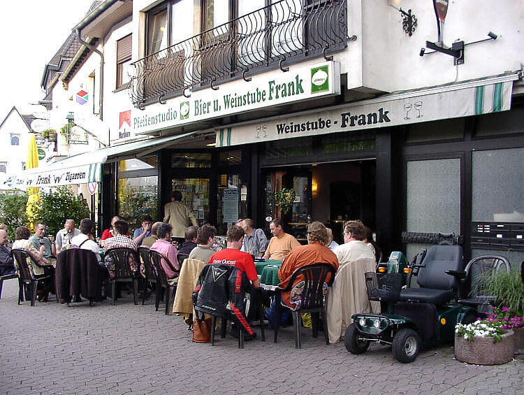Vers 17h la première journée du show prend fin. Bon nombre de visiteurs et à peu près tous les pipiers se rendent à l’hôtel recommandé par Achim. David, Georges et moi, nous nous installons dans nos chambres spacieuses et confortables. Cinq minutes plus tard, Georges réussit à arracher le distributeur de savon accroché au mur de sa douche. Le soir tout le monde s’est donné rendez-vous dans le centre de Rheinbach. Nous nous retrouvons sur une belle terrasse ombragée pour dîner. Georges, David et moi partageons le repas avec Frank Axmacher, Heiner Nonnenbroich, Tom Richard Mehret, Jürgen Moritz et quelques collectionneurs allemands. Bien que les Allemands soient nettement majoritaires, ils s’adaptent tout naturellement à nous et la conversation a lieu en anglais. Le repas est, à ma grande surprise, plus que respectable et les discussions intéressantes.