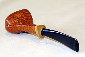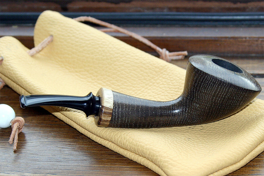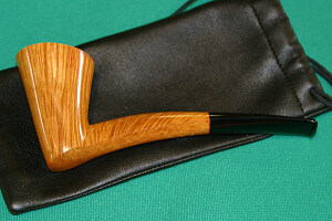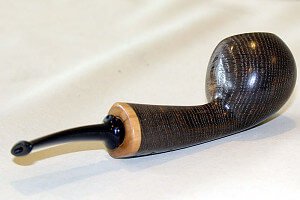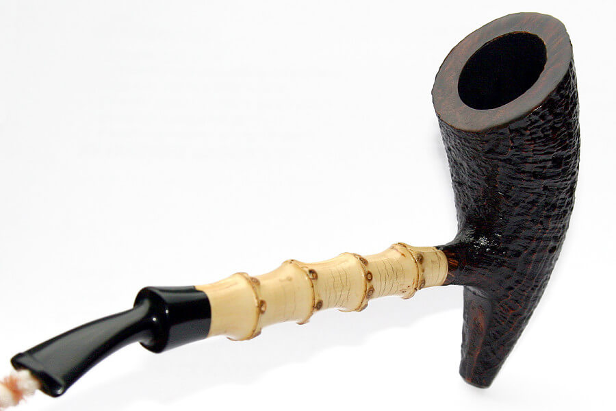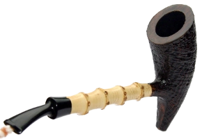 Plus récemment, Tom s’est mis à travailler avec du morta, du chêne fossilisé, d’origine autrichienne et cette année au Pipe Show de Chicago, c’est la consécration : ses pipes et notamment ses mortas se vendent comme des petits pains. Il y a quelques mois, Tom m’a fait une superbe morta avec une tige en bambou à quatre nœuds. Jolie comme tout. Et puis, ce goût ! Intense, sombre, profond. La compagne parfaite des latakias. Cette pipe, je l’adore. Et chose remarquable : les mortas de Tom ne sont pas noires comme celles de Trever : elles virent entre le gris, le brun et le verdâtre. Il en a même qui sont beiges. Sur ces couleurs on voit beaucoup mieux le grain du bois fossilisé. Et ce grain, il est fort spécial : très fin et très régulier. Et comme Tom arrive vraiment bien à harmoniser grain et forme, ses mortas sont réellement séduisantes. Autre point fort de Tom : ses rustications en filigrane qui laissent apparaître la flamme, ce qui fait que plein de curieux lui demandent si c’est des sablages. Comme je m’étais promis de m’offrir une autre morta, je choisis une beauté d’une remarquable légèreté et qui exhibe un grain absolument fantastique. Et de deux.