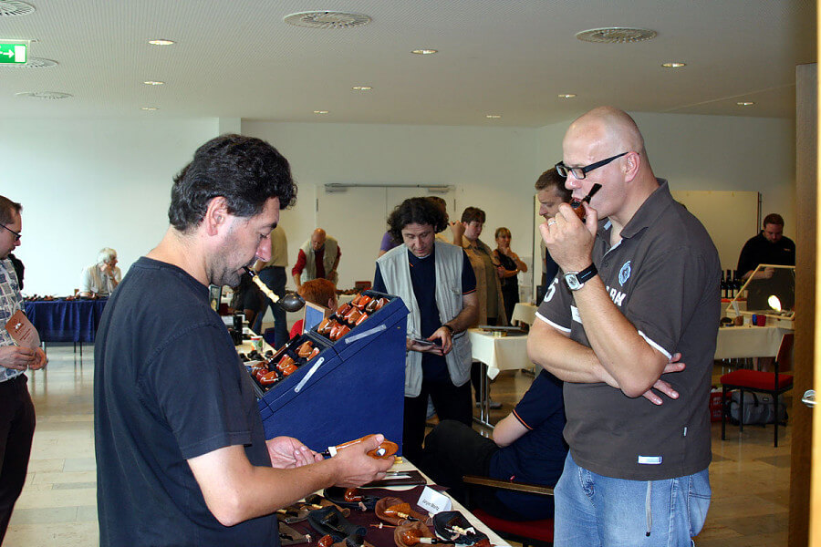 Quelques semaines après la publication de mon article, j’ai reçu un message intrigant en provenance d’Allemagne : "On te prépare une surprise". Rien de plus. Mystère. Puis pendant des semaines, silence radio absolu. Finalement, un jour on m’a dévoilé le secret : on était en train d’organiser une rencontre entre tous les pipiers présentés dans l’article et la fine fleur des collectionneurs allemands. Il fallait juste trouver l’endroit idéal et une date appropriée. Re-silence radio pendant des semaines. Et puis, coup de théâtre : cette réunion est annulée, mais sera remplacée par un véritable pipe show axé sur les pipiers allemands et auquel mes six poulains participeront. Et cet événement sera organisé par une des figures emblématiques de l’univers pipier allemand : Achim Frank, marchand de pipes à renommée internationale et inventeur de la fameuse méthode de bourrage portant son nom. Le German Pipe Makers and Estate show était né !