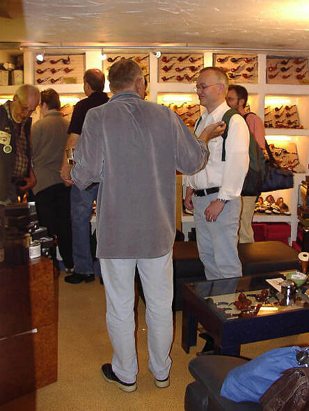 Je garde d’ailleurs un très bon souvenir de ma conversation avec Heinz Schwarzkopf, passionné de la pipe et gentleman parfait. Après le repas, nous nous rendons à la Weinstube d’Achim Frank. La terrasse est déjà pleine et on voit des pipes partout. Achim nous voit arriver et vient à notre rencontre pour nous inviter à visiter sa civette. Alors qu’il a exposé un millier de pipes de son stock sur les tables du pipe show, la civette avec un petit salon est remplie de pipes de tout genre. Le stock de Frank est impressionnant. Pareil pour les tabacs : tout un mur de Hausmischungen, des tabacs mélangés pour sa civette. Avec enthousiasme il commence à ouvrir des boîtes et à nous chanter les louanges de ces mélanges pendant que nous les humons. Georges et moi lui achetons quelques boîtes. David, Georges et moi finissons la soirée au bar en compagnie de Tom Richard et de deux autres Belges. Nous rentrons dans nos chambres vers minuit et demi. Comme j’ai fait attention à ne pas abuser des produits de la Weinstube, je me sens bien. Cependant, ma langue me fait l’effet d’un morceau de cuir. Parce que, oui, on pouvait fumer partout : dans le show, dans l’hôtel, dans le bar.