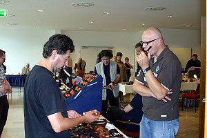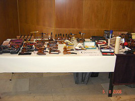 C’est le moment de retourner à la table de Georges pour aller voir comment ça se passe. Il a vendu quatre pipes, mais il a compris que la plupart des visiteurs sont descendus à Rheinbach pour acheter les produits des pipiers allemands plutôt que pour acquérir de vieilles anglaises ou des écumes. Ca n’empêche pas que Georges s’amuse bien. D’ailleurs son voisin de table, c’est mon ami Martin Reck que tous ceux qui suivent l’eBay allemand connaissent bien. C’est lui aussi qui fait les photos pour le site web de Frank Axmacher. A côté de Martin se trouve la table de Rolf Osterndorff, l’organisateur du premier pipe show européen à Cuxhaven. Après des salutations enthousiastes, il m’explique qu’il a annulé son show parce que Rheinbach, Cuxhaven et Bologne, c’est trop. Selon lui, la concurrence entre ces trois shows finirait par les tuer tous. A son avis, il faut un seul grand événement pipier en Europe, ce qui garantirait qu’il reste économiquement viable. Il a probablement raison. Ceci dit, je n’avais pas l’impression que c’était au fameux Mondial de la pipe qu’il pensait !