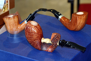 Comme désormais j’ai le portefeuille vide, il est temps de faire tranquillement le tour de la salle. David m’accompagne. Roland Schwarz et Jan Harry Seiffert ont finalement donné forfait, donc il ne faut pas les chercher. Nous rappelant la discussion dans le forum, nous examinons les Joura et les Barbi. Et bien, ça saute aux yeux : à côté des créations élégantes et raffinées de Barbi, les pipes de Joura paraissent bien ennuyeuses. D’ailleurs, j’en parle à plusieurs pipiers. Ils me rejoignent tous là dessus. Sur le stand de Bertram Safferling, il y a une pipe vraiment superbe, mais le reste de sa production manque de finesse à mes yeux. Nous nous intéressons peu à toutes les tables avec des pipes estate et aux stands de quelques pipiers allemands moins connus comme Holger Haettich, Nils Thomsen, Olaf Langner ou Hans Günter Noske. Nous découvrons le stand du pipier tchèque Jan Kloucek. Un monsieur passionné et très gentil. Des pipes vraiment impressionnantes par la perfection de leur flamme, mais qui semblent faites pour des géants ! Il doit employer des plateaux énormes. S’il y a des amateurs pour ce genre de pipes outre-Atlantique, les collectionneurs haut de gamme européens tendent à les dédaigner. Nous ne nous arrêtons pas au stand de Vauen, ni aux tables où le blender de Kohlhase & Kopp vous fait votre mélange de tabac personnel. Par contre en nous rendant à nouveau aux tables de Cornelius et de Paolo Becker, nous découvrons les pipes d’Axel Reichert. Le lendemain Achim Frank viendra d’ailleurs me présenter ce pipier et il sait bien pourquoi : Reichert fait des pipes impressionnantes qui sont le fruit d’une créativité toute personnelle. Toute une panoplie de formes certes étranges, mais racées. En plus, elles sont vraiment bien exécutées et finies. Il ira loin. Si je l’avais connu plus tôt, je l’aurais présenté sans hésitation dans mon article. Je le lui dis d’ailleurs et après mon retour je contacte Achim et Axel pour acheter une longue horn dont la ligne pure m’avait particulièrement séduit.