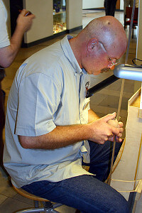 A 16h Achim fait une démonstration de sa célèbre méthode de bourrage devant un public impressionné. Le lendemain il y aura un concours de fumage, mais comme les plaisirs de ce sport m’ont toujours échappé, je n’y assiste pas. Par contre, il est très intéressant de voir les différentes étapes de la production d’une pipe que les meilleurs pipiers font ensemble et qui sera vendue aux enchères sur eBay pour une bonne oeuvre. Quand Cornelius Maenz passe de longs moments à frotter avec divers papiers de verre, quand il fait le tuyau et quand il passe la teinture, David suit, concentré et admiratif. D’ailleurs Cornelius donne quelques tuyaux pour bien ouvrir les pores du bois pour qu’il prenne bien la teinture. A la fin de la deuxième journée, l’Elephant Foot avec une longue décoration en corne est prête. Elle est superbe.