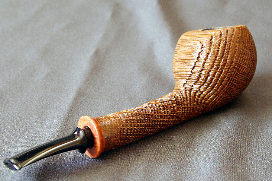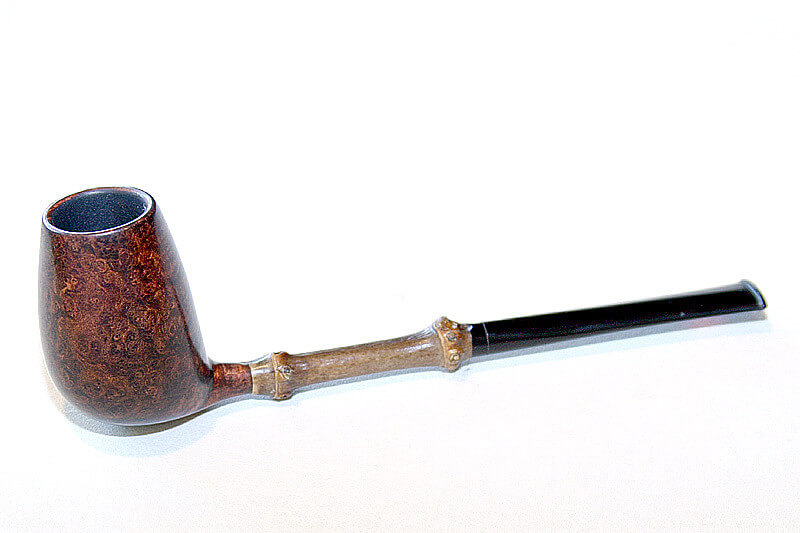 Je passe chez Jürgen Moritz. Récemment il m’a brisé le cœur, ce type. Juste avant son départ pour l’Amérique, j’avais pu voir les photos de toutes les pièces que Jürgen avait préparées pour le Chicago Show. Une multitude de belles pipes. Mais il y en avait une en particulier pour laquelle j’éprouvais un coup de foudre immédiat et définitif. Remarquez, rien de spectaculaire. Au contraire, une billiard classique avec une tige très fine décorée d’un seul nœud de bambou. Elle était élégante, svelte et elle ne se prenait pas trop au sérieux. A vrai dire, elle me faisait sourire à chaque fois que je la regardais. Bref, sans tarder j’ai contacté Jürgen. Ah, la douche froide ! Jürgen venait de passer une soirée au restaurant avec Frank Axmacher et tous deux avaient emmené leurs pipes prêtes pour le voyage transatlantique. Dès que Frank avait vu l’élue de mon cœur, il ne l’avait plus lâchée et Jürgen avait fini par la lui offrir. Apparemment encore un qui partage mes goûts ! Par ailleurs, le soir au bar, Frank, avec un évident plaisir, m’a montré cette pipe. Immédiatement elle m’a fait sourire. Cette pipe, elle est ensorcelée que je vous dis ! Mais retournons à nos oignons. Ce qui me frappe d’emblée quand je me retrouve devant la table de Moritz, c’est la prédominance de pipes à tige en bambou et que ce géant qu’est Jürgen a une prédilection pour les pipes peu volumineuses, légères et fines. Je vois d’ailleurs de nombreuses pipes qui me séduisent. Une des dernières pipes que je découvre, presque sur le bord de la table, me donne un choc. Je n’en crois pas mes yeux. Ce n’est pas possible ce que j’ai vu ou cru voir. Je m’approche, je la dévisage, je la soupèse, des doigts je touche et retouche sa tige. Tous mes sens en éveil confirment ma première impression : c’est joli comme tout, c’est d’une élégance et d’un raffinement rares et surtout c’est phé-no-mé-nal ! Voilà une pipe dont la tige en bambou fait exactement 6,8mm de diamètre ! Oui, 6,8 ! Imaginez-vous devoir percer ça à du 4mm ! Inutile de dire qu’on n’a pas droit à l’erreur ! Un tour de force d’autant plus que la tige a conservé suffisamment de solidité. D’ailleurs quand je montre la pipe à Trever, il est visiblement impressionné. Bref, je n’ai pas hésité une seconde : ce comble de finesse, il me le fallait. Vendu. Je l’ai laissée sur la table et le soir Jürgen m’a raconté qu’il avait dû décevoir une vingtaine d’intéressés. Il paraît même qu’un type lui a proposé de payer plus que moi. Quand on aime, on ne compte pas. Je le comprends.
