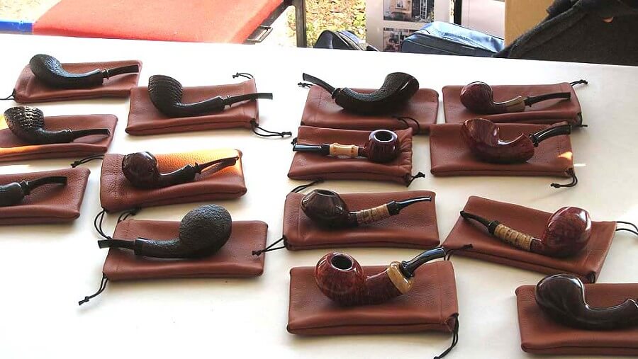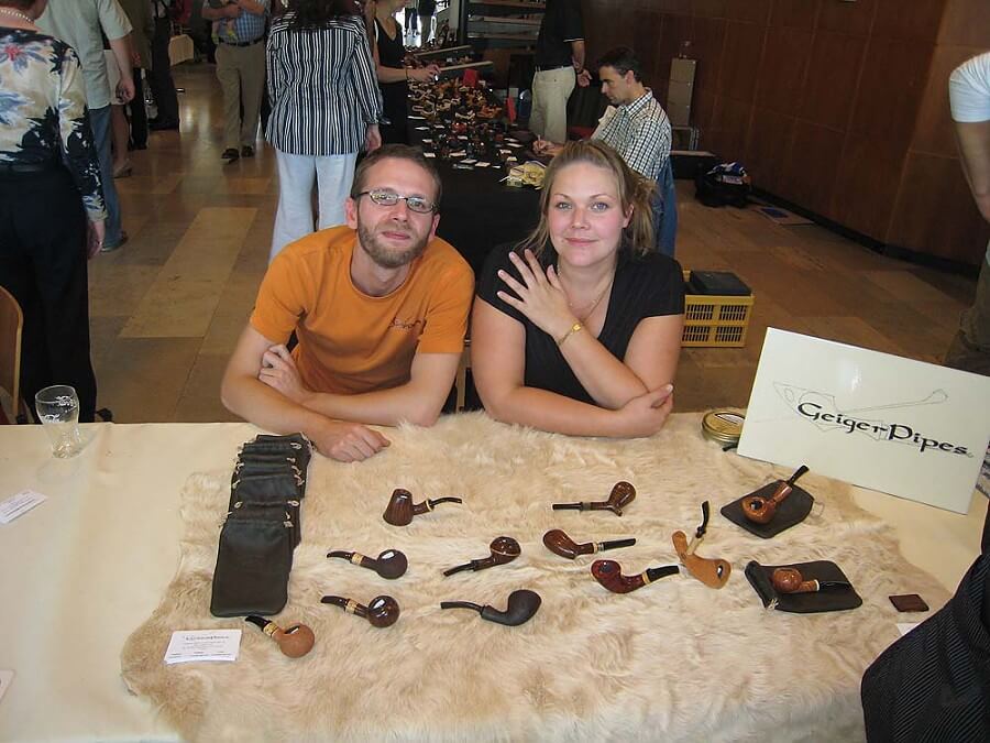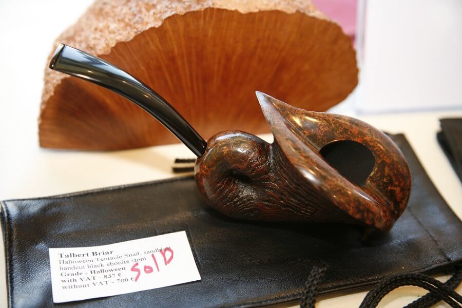 En route vers le stand de mon ami Heiner Nonnenbroich, je passe devant la table de Trever et Emily. C’est la première fois que nous nous rencontrons. Il y a assez peu de pipes, mais Trever a tenu parole : plutôt que de s’adapter au public allemand friand du style danois qui favorise des pipes passablement petites en finition lisse, il est venu avec l’intention de se démarquer avec des pipes viriles et costaudes avec des sablages à l’américaine. Il a même eu la témérité de proposer aux collectionneurs allemands une pipe verte. Et il a raison : c’est une des premières à se vendre. Quand le lendemain, je parle sablages avec Cornelius Maenz, je l’invite à venir inspecter ceux de l’Américain breton. Cornelius les approche de ses yeux, les regarde longuement. Quand il repose la dernière pipe sur la table, il me dit que c’est super comme travail. Venant de lui, c’est un compliment qui compte. Je sais que Trever loge chez Jörg Wittkamp, un des plus célèbres collectionneurs d’Allemagne et par ailleurs un homme remarquablement discret et charmant. Je sais à peu près quels trésors sont soigneusement conservés dans l’armoire spécialement aménagée de Jörg. Alors je demande à son invité ce qu’il trouve de la fameuse collection. Trever ne se perd pas en de longs discours. Par contre, son regard illuminé en dit long. Et oui.