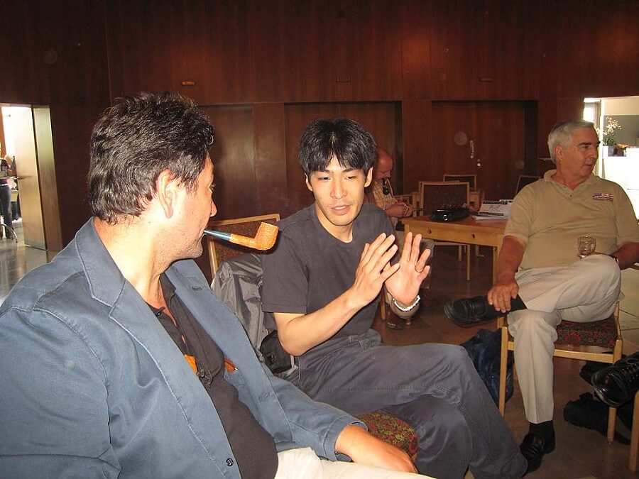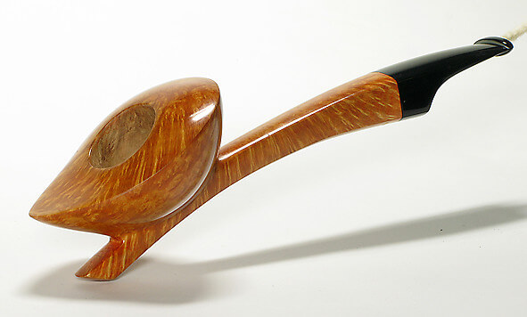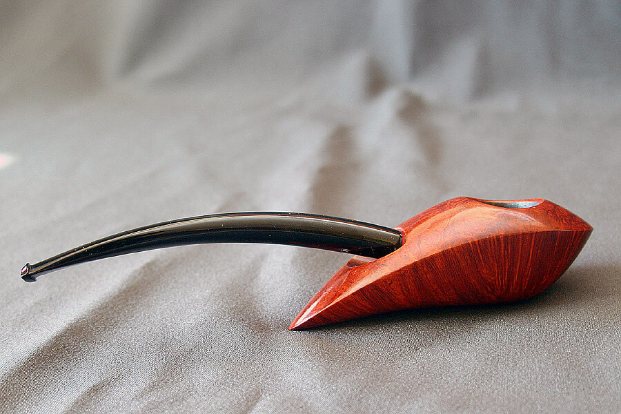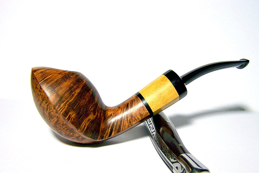 Me voilà satisfait. Mes achats sont faits et j’ai réussi à mettre la main sur quelques pièces exceptionnelles qui m’émeuvent vraiment. Ouf. Mission accomplie. Je sais, je sais, c’est pitoyable, un obsédé de la pipe. Quoi qu’il en soit, désormais Relax Max. C’est le moment de fraterniser avec d’autres passionnés. Je retrouve donc avec grand plaisir Heinz Schwarzkopf, ce gentleman qui parle un anglais impeccable. Je le présente à David et deux minutes après il lui achète une très jolie pickaxe. Je me retrouve également avec Jörg Wittkamp, puis je m’entretiens un peu avec Per Billhäll. Soudain une main se pose sur mon épaule et j’entends une voix que je reconnais immédiatement : le fils perdu est revenu ! Revoilà mon grand ami Martin Farrent qui, il y a quelques années, avait complètement disparu de la scène pipière. Un vrai bonheur de le retrouver. Une autre rencontre émouvante est celle avec Jörg Lehmann. Jörg, je le connais depuis des années. Il m’a énormément appris et j’ai toujours admiré son sixième sens infaillible pour découvrir et lancer les nouveaux talents. En plus, il a une collection qui fait saliver. Après l’accolade et un quart d’heure de bavardage, il me demande si j’ai déjà repéré le nouveau pipier japonais. Ben non, j’ai bien vu un visiteur japonais, mais aucun pipier. Ah, mais justement, ce soi-disant visiteur, c’est le pipier en question mais qui n’a pas de table. Alors Jörg me convainc qu’il me faut absolument regarder les pipes de ce jeune homme immigré récemment en Allemagne et qui taille des pipes depuis tout juste six mois. Six mois, c’est rien. Je me demande donc pourquoi je devrais perdre mon temps avec le 326ième amateur débutant. Mais Jörg insiste. OK alors. Mais d’abord prenons une bière ensemble. Jörg et moi sommes invités à la table de Tom Eltang, Per Billhäll et Nanna Ivarsson. Je me retrouve à côté de Nanna qui est ravissante. Quant à sa sœur, elle pourrait faire fondre un glacier. Mais passons. Jörg interpelle le Japonais qui s’appelle Ken et il lui demande de me montrer ses pipes. Le jeune homme s’exécute et les sort de leurs pochettes. D’emblée je suis surpris. Six mois d’expérience et il fait ça ! Quand je les examine, je n’en crois pas mes yeux : des formes harmonieuses, pures, parfois même compliquées, des lignes précises et nettes, des décorations soignées, des transitions absolument impossibles à sentir sous les doigts, du grain parfaitement bien lu, des tuyaux en ébonite polis comme des miroirs (très difficile pour un pipier manquant d’expérience !), des becs finement exécutés et qui immédiatement me rappellent les becs de Cornelius, à mon avis les tout meilleurs au monde. Incroyable. Comme j’ai quand même mes doutes, je demande au jeune homme si avant de partir pour l’Allemagne il avait étudié avec quelque maître japonais. Non, monsieur. Donc il a commencé en Allemagne ? Oui, monsieur. Et depuis combien de temps ? Six mois, monsieur. Et il a appris tout ça tout seul ? Non, monsieur. J’habite tout près de l’atelier de Cornelius Maenz, monsieur, et lui, il m’a appris. Tout s’explique. Une pipe en particulier m’attire : bien que sa teinture et sa finition ne soient pas encore à la hauteur, la forme est exquise avec des lignes bien définies et une belle décoration en buis. En plus les perçages sont au-delà de tout reproche et le tuyau est vraiment remarquable. Je lui demande s’il veut me la vendre. Oui, monsieur. Je lui demande son prix. 150 euros. Il ne faut pas hésiter. Vendu.