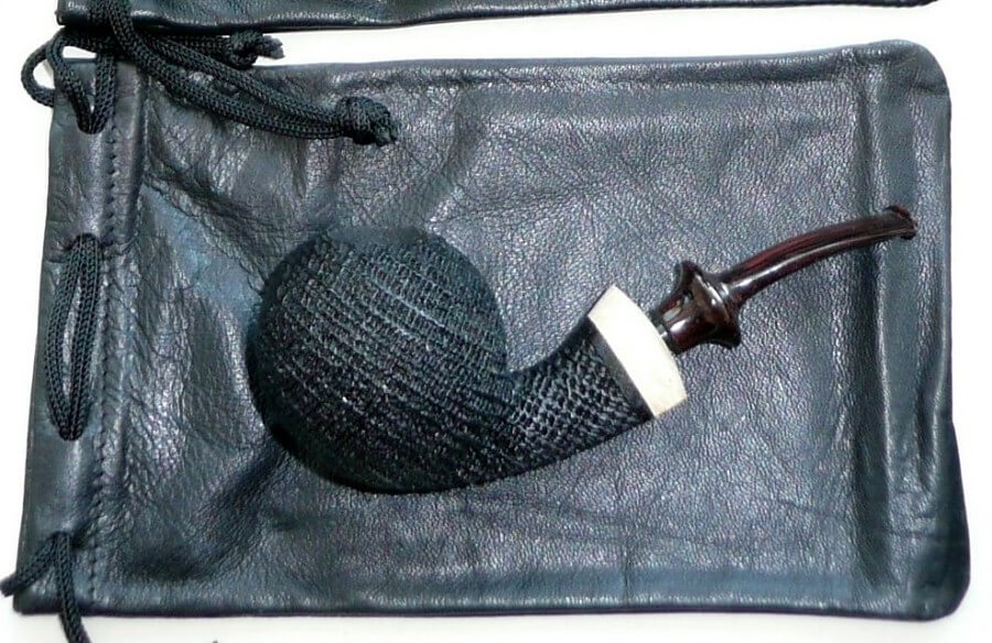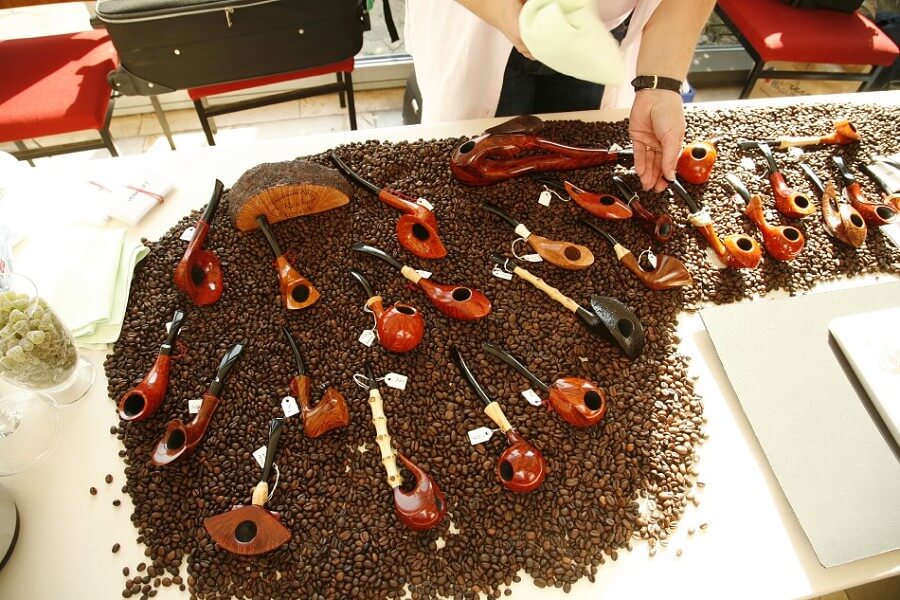 Avant le plaisir, le devoir ! Comme je dois encore de l’argent à Tom Richard Mehret, c’est d’abord chez lui que je m’arrête. Je suis un fan inconditionnel de ses mortas et Tom le sait. Il sait aussi qu’un superbe sablage me fait fondre. Il a donc bien préparé son coup : l’accolade terminée, il me met dans la main une morta avec une couleur fascinante virant entre le kaki, le brun et le gris, et qui arbore un sablage tout simplement époustouflant : du travail d’orfèvre, l’œuvre d’un miniaturiste, de la dentellerie sur pipe. Le meilleur sablage de sa carrière, qu’il me dit. Et je sais qu’il a raison. En plus elle est d’une impressionnante légèreté. Pourtant j’hésite parce que sa forme me plaît moins que certains autres modèles que je vois sur la table. Alors il m’en présente une autre : plus claire avec sa couleur beige/brun, elle a une longue tige avec ce même genre de sablage en dentelle, mais sur le foyer le sablage est un cran en dessous de l’autre. Par contre, j’aime beaucoup sa forme plus élancée. Ah, quel dilemme ! Choisir, c’est mourir un peu et c’est la mort dans l’âme que je me décide pour la deuxième. Dès que je la fume, cette pipe confirme ce que je préconise depuis des années : tout amateur de latakia devrait s’offrir au moins une morta. Ne me demandez pas pourquoi. Essayez vous-mêmes.