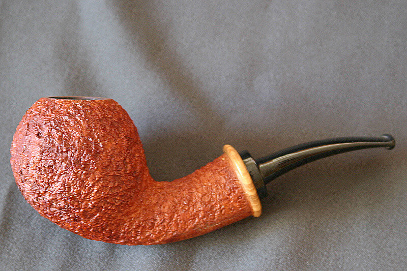 Samedi, une heure avant l’ouverture du show, Georges et moi arrivons en même temps que David Enrique sur le parking de la Stadthalle de Rheinbach. Accueil par Achim et par sa main droite, Willi Albrecht, puis David et Georges commencent à déballer leur marchandise et à arranger leurs tables. J’ai le privilège d’être le premier à découvrir les pipes que David a préparées pour son baptême du feu. D’abord il me montre une pipe en finition vierge commandée il y a quelques mois. Une merveille d’élégance et de finesse dans une bruyère très claire qui s’harmonise parfaitement avec la bague en ivoire. Me voilà déjà comblé. Arrive alors Martin Reck, membre de notre forum, pour prendre livraison d’une commande, une poker sablée. Martin est plus que satisfait du résultat. Je le comprends parfaitement : le sablage est le meilleur que David a fait à ce jour avec son ring grain régulier et dense mis en valeur par une belle teinture entre le tan et le brun. Sort alors de la valise de David une longue pipe lisse dont le fourneau à la forme originale et la tige svelte à la Paolo Becker captent d’emblée le regard. Je suis en train de l’admirer et de me dire que celle-là viendra vivre en Belgique quand j’entends ce terrible verdict sortir de la bouche de mon ami Martin : vendu ! Je me console avec l’idée qu’elle sera entre de bonnes mains. Et puis, pas de panique, je sais que David a emmené une vingtaine de pipes. Je découvre donc un bel échantillonnage des compétences actuelles du Sanclaudien adoptif. Si évidemment il n’a pas encore développé son style à lui, il est par contre évident qu’il est éclectique et polyvalent : il fait de tout avec succès, une prince toute britannique, une blowfish ou une horn à la scandinave, une tige façon Lars Ivarsson, une pickaxe beckeresque. Ses sablages sont bien définis, mais feraient plus d’effet avec davantage de profondeur. Le grain de ses lisses est bien mis en valeur par des teintures à contraste, même si la finition manque encore la luminosité chatoyante et cristalline qui est si typique des pipiers haut de gamme. Par contre, et ça saute aux yeux, au niveau de la finesse de ses tuyaux et de la façon dont sont modelés ses becs, David n’a absolument pas à rougir devant la compétition qui pratique des prix trois fois plus élevés. Une autre constante est la remarquable légèreté de ses pipes, même des modèles volumineux. De la bruyère de qualité longuement âgée.