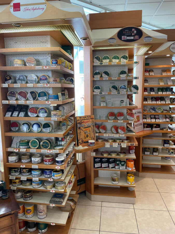 Au rayon tabac, les Davidoff, les tabacs maisons, Capstan, three Nuns ainsi qu'un énorme choix de nouveaux tabacs sortis par Vauen.. À cela s'ajoutent les classiques Amphora, Kentucky etc.... Et bien heureusement encore quelques C&D et GL Pease...