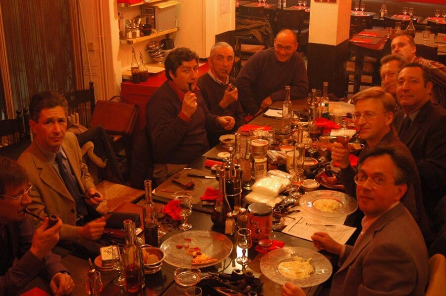 Carl-Franz nous ayant lâchement lâchés, nous commençons avec Kalabash à préparer quelques mesures de rétorsions, mais il y a du monde, et nous remettons cela à plus tard. Nous rejoint ensuite Vincent, du Pipe Club de Paris. Comme le vin est déjà sur la table, rouge ou rosé, nous passons aux choses sérieuses, en essayant de manger proprement les délicieuses pizzas servies comme apéritif. il y a déjà quelques boîtes qui traînent sur la table, nous ouvrons nos sacs et sortons nos petites affaires - j'entends par là, pas de malentendu, nos pipes, nos tabacs, etc.
