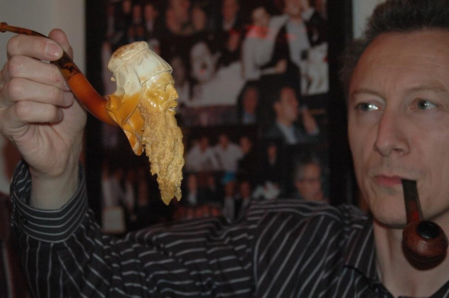 Très vite, Ambre marque un gros coup : il a ramené une boîte de Balkan Sobranie, qui doit dater d'une vingtaine d'années. j'ai craint à un moment qu'il ne reparte qu'avec la boîte, nous avons tous pu goûter ce mélange devenu rarissime. Grande et belle surprise, une douceur, un goût que nous ne retrouverons sans doute jamais. Philippe a aussi amené deux très belles écumes anciennes, l'une magnifiquement sculptée et colorée, l'autre avec un os d'albatros. Thierry la reconnaît, il avait travaillé à sa remise à neuf.