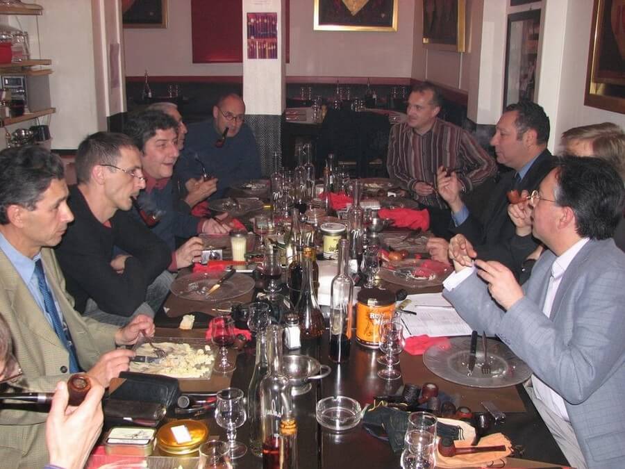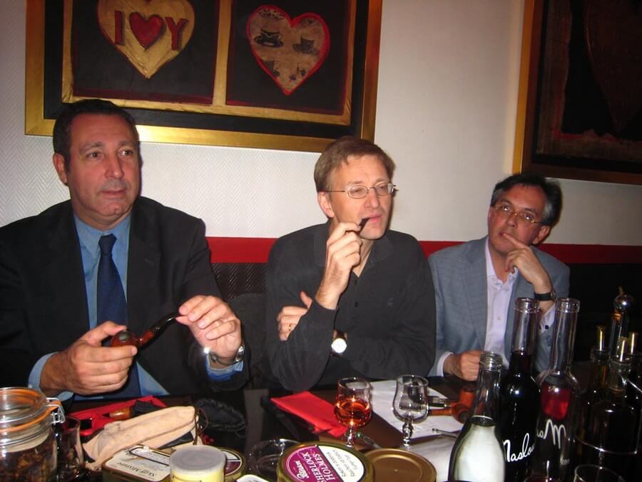 Nous sommes quelques uns à nous régaler du Balkan Sobranie, mais Laurent M. est déçu. Jean-Daniel goûte le HH latakia, je suis heureux qu'il l'apprécie, alors que Laurent M., il y a des soirs comme ça, est déçu. Il marmonne quelque chose à propos du Torina de Schurch, mais comme il est très gentil et ne veux pas faire de peine, il ne le dit pas bien fort.