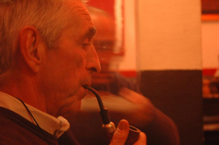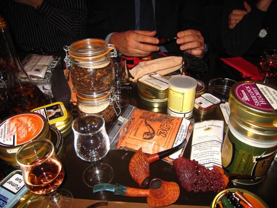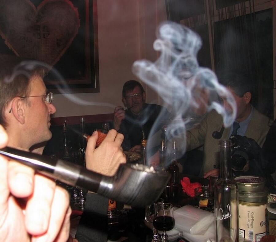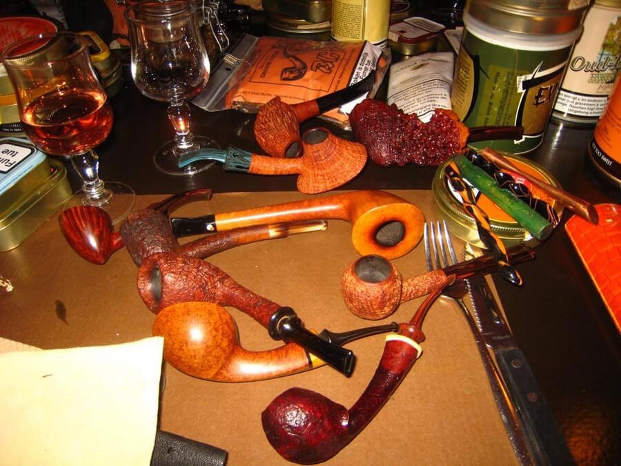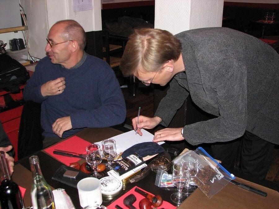 Nous n'avons pas compté les pipes, Laurent M. a pris la peine de noter soigneusement, il y a 37 mélanges différents, sans oublier quelques pochettes et le mélange personnel de Michel, que je me promets de goûter plus tard dans la soirée. Très vite, nous retrouvons les gestes familiers, comme de vider son verre et de s'en bourrer une bonne petite. Force est de constater que grâce à l'aération, nous ne serons pas gênés par la fumée.