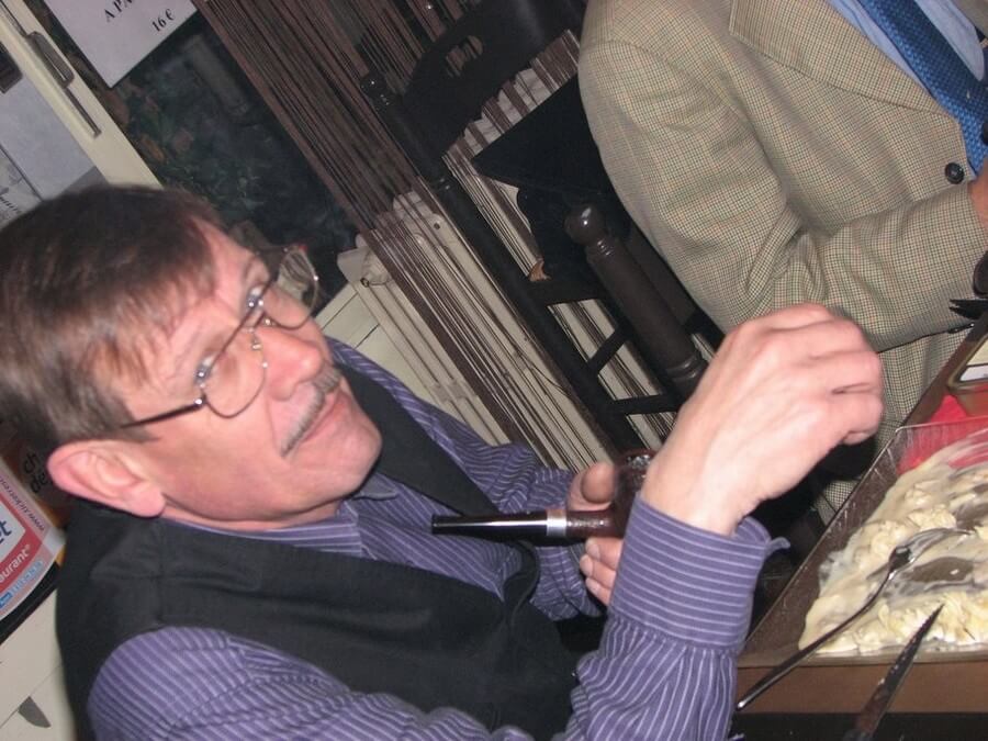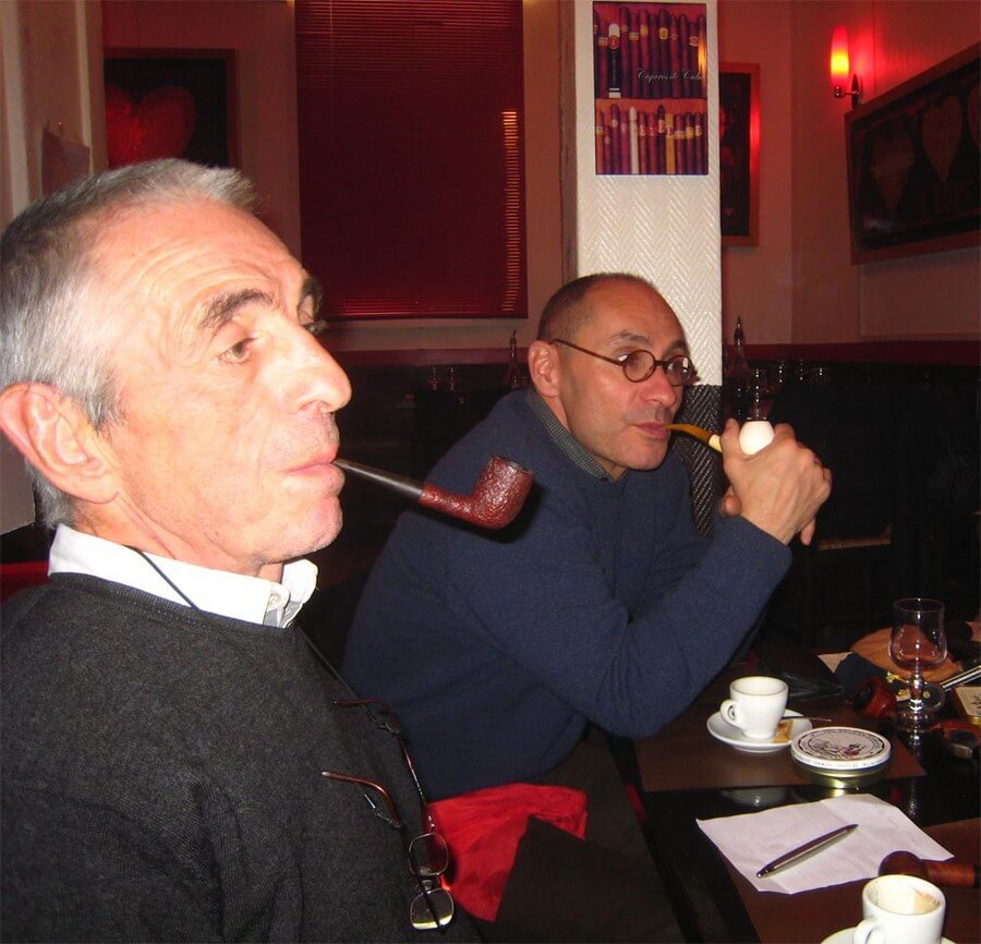 Il n'y a pas que lui de gentil d'ailleurs : j'essaie, comme de juste, de dire du mal des absents, mais je ne suis pas suivi. Michel, qui au début du repas s'était mis tout là-bas, en bout de table, semble bien s'amuser. Il a les yeux qui brillent. Il nous annonce qu'il va être grand-père, et va commander une pipe à un artisan pour l'occasion. Thierry me parle de me faire entrer dans la Confrérie, mais comme le costume ne m'ira pas, je refuse. Jean-Daniel, pour le consoler, achète une pipe à Thierry, il va pour la première fois fumer une pipe fabriquée par quelqu'un avec qui il a passé la soirée. Certains ont cru que j'allais sortir de ma poche les pipes du groupe, mais encore un peu de patience...