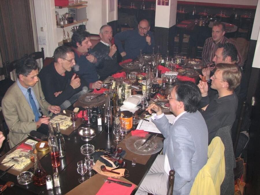 D'autres pizzas apéritives arrivent, et l'on doit pousser tout l'imbroglio pour faire de la place aux antipasti. En plus de tout cela, quatre d'entre nous sont venus avec leur appareil photo, il y aura de quoi faire pour les illustrations ! C'est décidé, nous faisons une pause fumage, et nous ne rallumerons nos pipes qu'une fois les plats finis. Or donc, les premières pipes se vident, les secondes sont bourrées, on entend plus que le cliquetis des appareils photos et celui des briquets. La pause est de courte durée, le brouhaha reprend très vite. Comme Thierry, assis à côté de moi, parle à des personnes à l'autre bout de la table, j'ai cru pendant tout le début de la soirée que Philippe, dit Harvey, était un mime. Mais non, il parle, mais avec la voix de Thierry. J'ai pu l'entendre quand Thierry est monté sur une chaise pour une photo de groupe. Vincent ne nous connaît pas, il craint à chaque fois de me déranger, il me demande de l'inscrire sur le groupe, il ne sait pas encore que le millième, c'est lui.