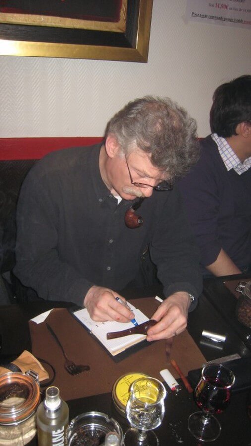 Certains sont venus presque les mains vides : Ambre ne nous a pas amené d'écume sculptée, pas de mélange disparu depuis vingt ans, il faudra que je lui en touche deux mots. Thierry n'a pris ni pipes à vendre, ni appareil photo. Et quand je demande à Laurent M. de noter les mélanges présents, il préfère faire passer une feuille. Le résultat n'est pas mal : 44 mélanges, 52 pipes !