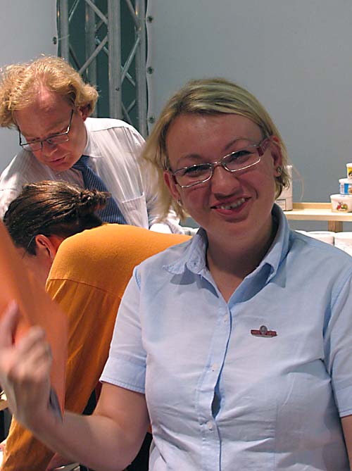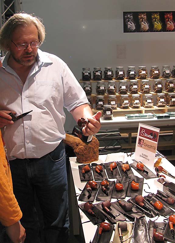 Je termine ma visite du stand Synjeco par une discussion avec Lev Vasiliev, marchand de pipe à Saint Petersbourg. Il présente deux gammes de pipes, premièrement des pipes high-grade d'un pipier russe (35 ans de métier), Grech et deuxièmement les pipes PSStudio dessinées par Grech, mais réalisées par trois jeunes pipiers.