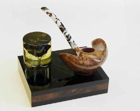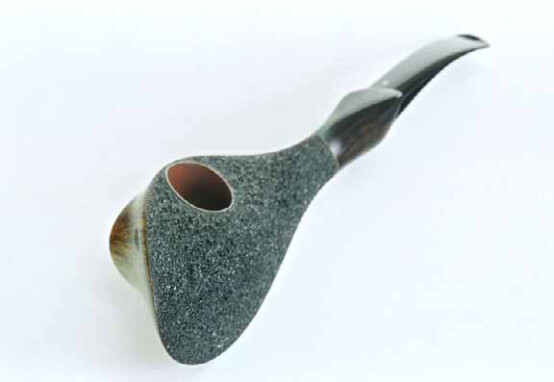 - L'autre partie de votre travail est une approche en mode "collage" du design pipier. Vous prenez une partie de pipe historique, ainsi que Vesz le fait parfois avec ses Raindrop, et vous la complétez avec des parties nouvelles qui s'accordent en un tout grâce au concept, à la réalisation et à la couleur, obtenant ainsi une coordination entre ancien et nouveau. Vous savez de quelle pipe je suis en train de parler, il s'agit bien sûr de la ”Piercing Meerschaum“, qui m'a fait grande impression. Au contraire de Vesz, vous avez décidé, dans une approche artistique moderne, de compléter la partie historique avec des éléments coulés en résine acrylique. Vous avez ainsi réalisé une division transparente de la structure des parties nouvelles, qui se marie fabuleusement avec le fini élaboré des parties anciennes. J'ai été fasciné par cette pipe, et j'y suis revenu de nombreuses fois parce que j'aime les choses qui dévoilent de nouveaux secrets comme le font, par exemple, les pipes de Tokutomi. Dites-en nous plus sur la création de cette pipe, quelles ont été les influences pendant ce travail ? Allez-vous créer quelque-chose de semblable dans le futur ?