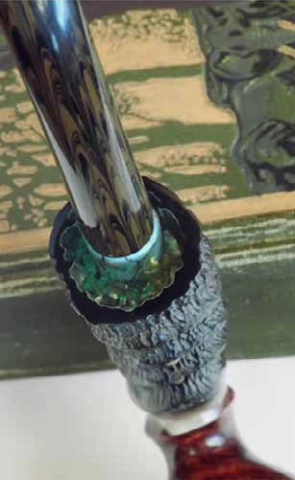 - J'ai récemment créé une "Grand Billiard, 9mm" pour un client allemand, avec pour thème souhaité "les Quatre Saisons". J'ai répondu à cette demande avec quatre tuyaux séparés. Chacun était en acrylique noir avec une partie transparente. Chaque partie transparente contenait quelque-chose en rapport avec une des saisons. Les inserts étaient: des pointes de feuilles de fougère verte pour le printemps, des pétales séchés jaunes et rouges pour l'été, des morceaux de tabac ribbon cut pour l'automne et des morceaux d'ivoire de mammouth et de nacre pour l'hiver.