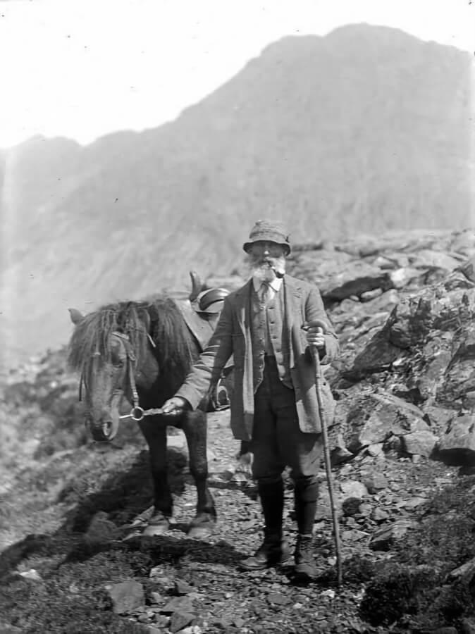 Debout sur un chemin rocheux avec son poney et son chapeau en tweed, il était