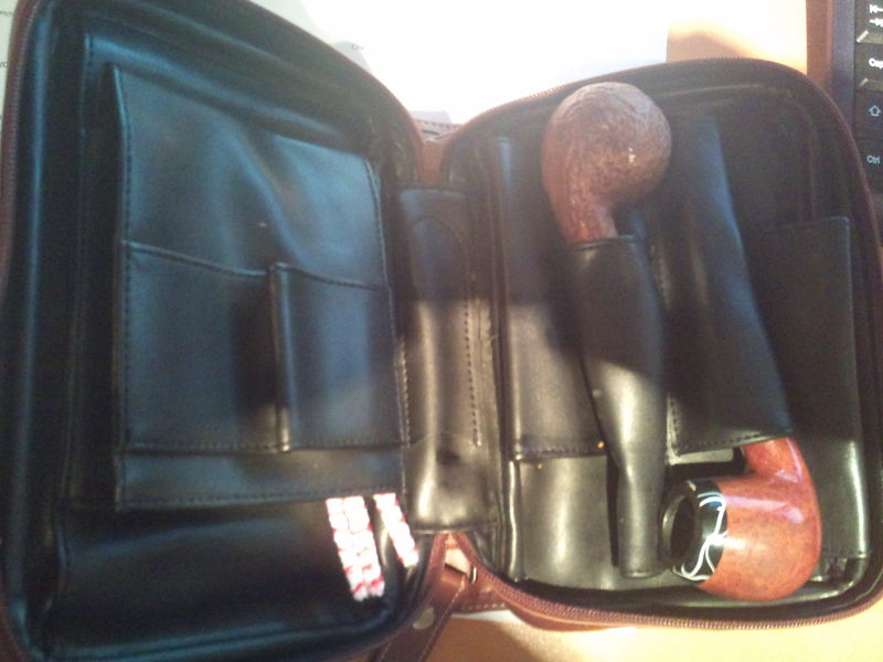 Voici l'intérieur de ma sacoche avec les 4 compatiment pour mes pies et de l'autre coté l'emplacement pour mettre un paquet de cure pipes ou un paquet de tabacs ainsi qu'une grosse boite d'allumette.