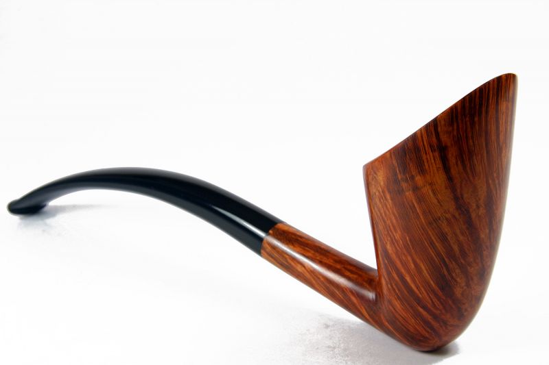 La pipe est directement inspirée de la forme dessinée par G. Holbek pour Pibe Dan. La finition est lisse, plutôt claire mais avec mise en valeur du grain. La pipe est bien flammée tout autour du fourneau. Le tuyau est en ébonite. La pipe est entièrement faite main. Très légère !