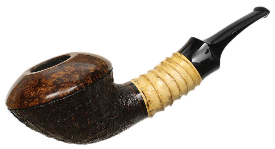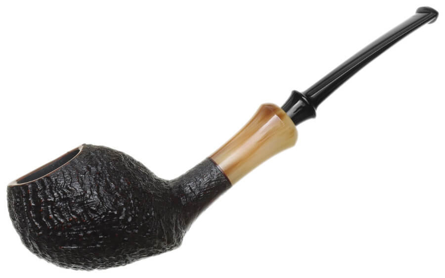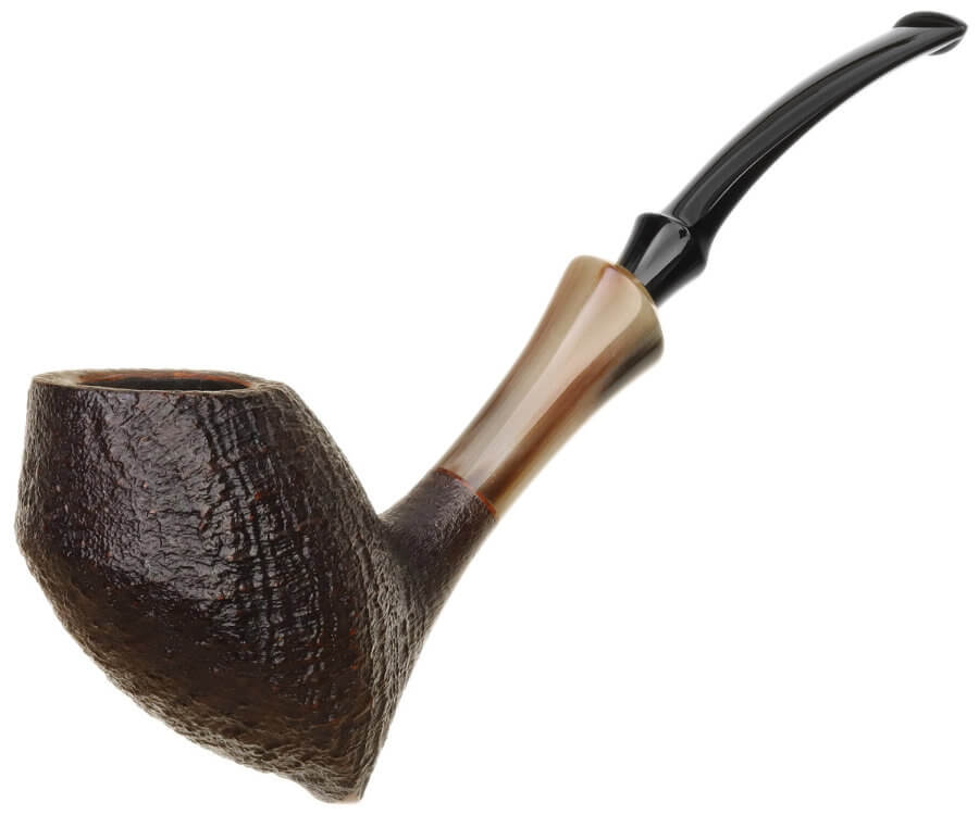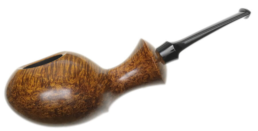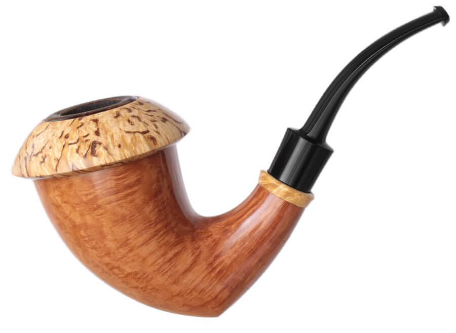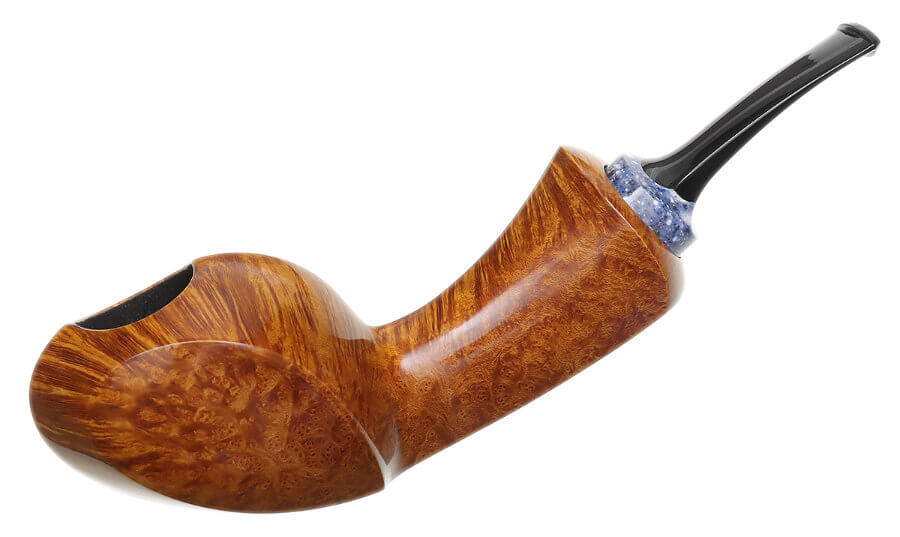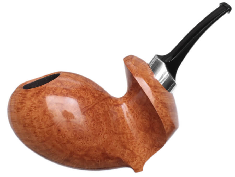 Il propose une soixantaine de pipes par an, lisses ou rustiquées. Il travaille de façon classique, en insistant particulièrement sur le polissage final. Et il s'attache particulièrement à l'ouverture et au travail du bec. Egalement à la liaison tige-tuyau. Ses tenons sont renforcés avec des tubes en acier inoxydables.