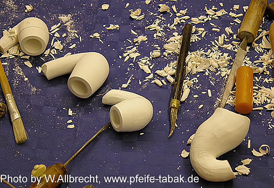 Pour les tuyaux, s'il utilise rarement de l'ambre, il travaille le plus souvent avec de l'ambrolith, plus abordable. Et pour raccorder la tige au tuyau, il utilise un pas de vis en buis pour la première, et en os pour la seconde.