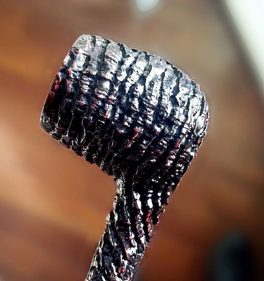 Cristian et Cinzia partent généralement d'une forme définie, reproduite sur la bruyère, sous le meilleur angle. Il procède à une découpe grossière de la forme, puis s'attaque aux perçages, puis au flocage. Une fois la bruyère finie, il s'attaque au tuyau. Viennent ensuite les étapes de finition, teintes à base d'eau ou d'alcool, carnauba ou shellac, pour finir par les marquages.