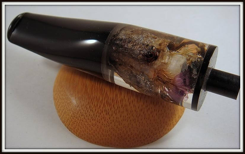 Cumberland, acrylique, mais aussi en plastique, qu'il coule en les mêlant à des plantes, des fleurs, ou à des insectes.
