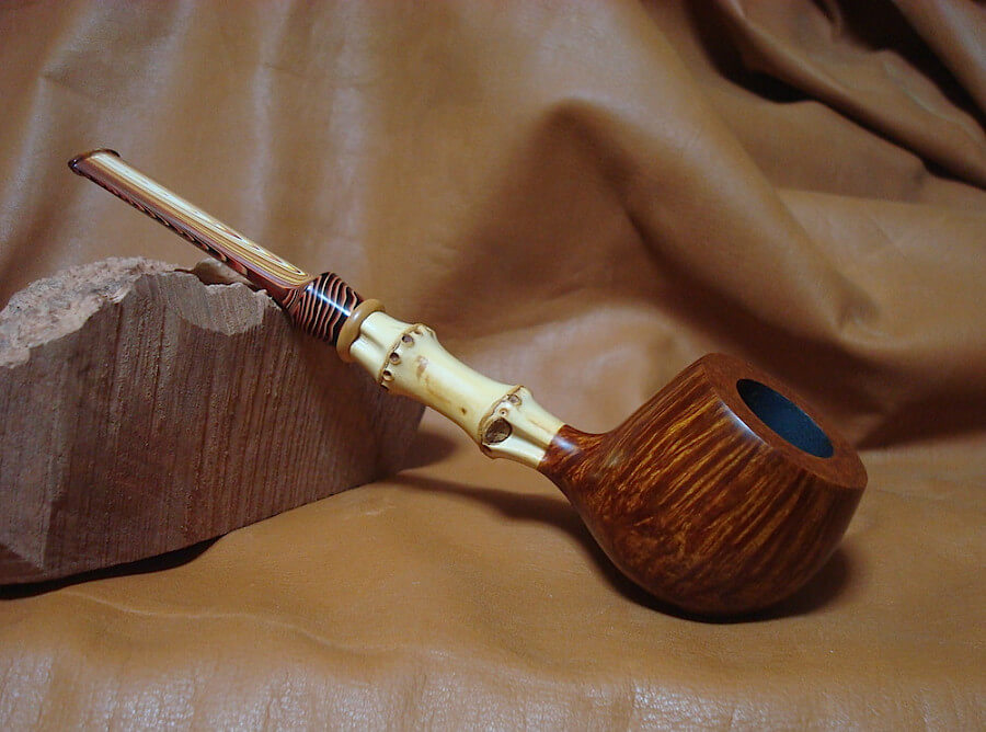 Sa bruyère vient de chez Mimmo, et si jusqu'à présent il ne pouvait la laisser reposer que trois mois, il a reçu, à la mi-2014, cent vingt blocs, qui vont pouvoir sécher encore plus longtemps. Ses tuyaux, toujours en ébonite ou en cumberland, proviennent des maisons allemandes Janzen ou Sem - parfois aussi de New-York Hamburger, mais il est plus difficile de se fournir chez eux. Il va même jusqu'à réaliser lui-même ses pochettes.