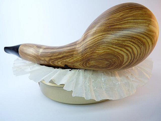 Abi espère bientôt proposer des pipes en bruyère. Ses tuyaux sont en ébonite allemand, et en acrylique. Pas de décorations superflues, les lignes et le grain de l'olivier suffisent. Il propose entre 50 et 60 pipes par an, ce qui lui semble un maximum, lisses, mais là aussi il espère proposer d'autres finitions. Tailler une pipe commence pour lui dès le moment où il va chercher son bois, puis il attend de voir des formes se dégager des blocs au séchage. Il n'utilise pas de tour. Il emploie surtout des limes, et s'il utilise une perceuse pour les forages, c'est à main levée - et pourtant, pour lui, une chenillette doit passer "comme dans du beurre" pour que la pipe quitte l'atelier. Il utilise aussi du papier de verre, grain 800 à 2000, et un instrument électroportatif pour passer soit de la carnauba, en trois passages distincts, soit du shellack.