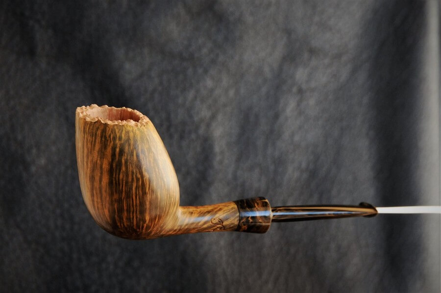 Giordano commence par étudier le grain de la bruyère, il y dessine une forme, et de cette forme vient celle du tuyau. Il réalise ainsi entre 40 et 50 pipes par an, dans toutes les finitions - mais sa préférée reste la rustiquée multicolore. Il n'utilise pas de tour, juste une perceuse - et lesprit, le cœur et les mains pour le reste.