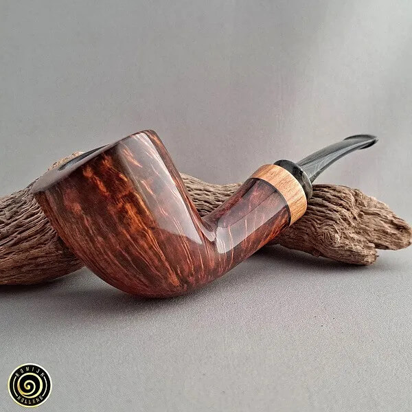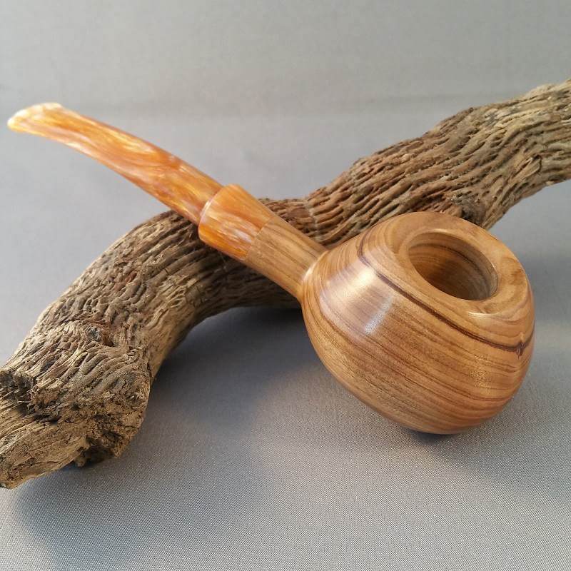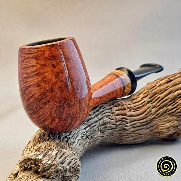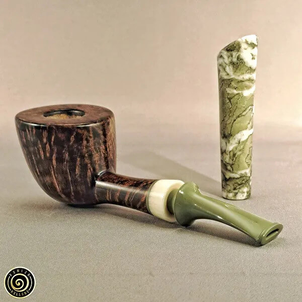 Sa bruyère vient de Mano et Mimmo. La majorité de ses tuyaux sont en acrylique, mais il propose aussi de l'ébonite. Ses bagues sont en acrylique, maisil songe à en réaliser en pierre dans le futur.